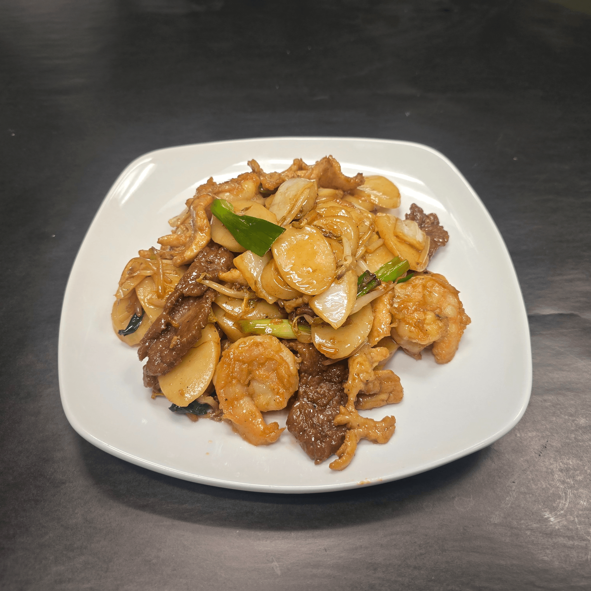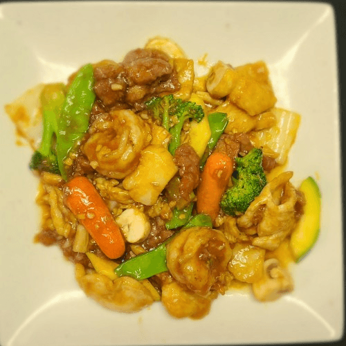 An exciting combination of jumbo shrimp, white meat chicken, prime cuts of beef, fresh vegetables, peanuts, and chili pepper sautéed in a spicy, peppery sauce