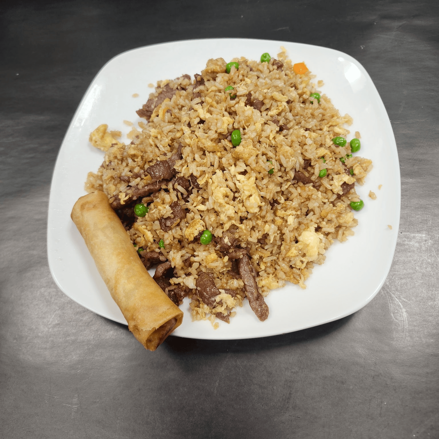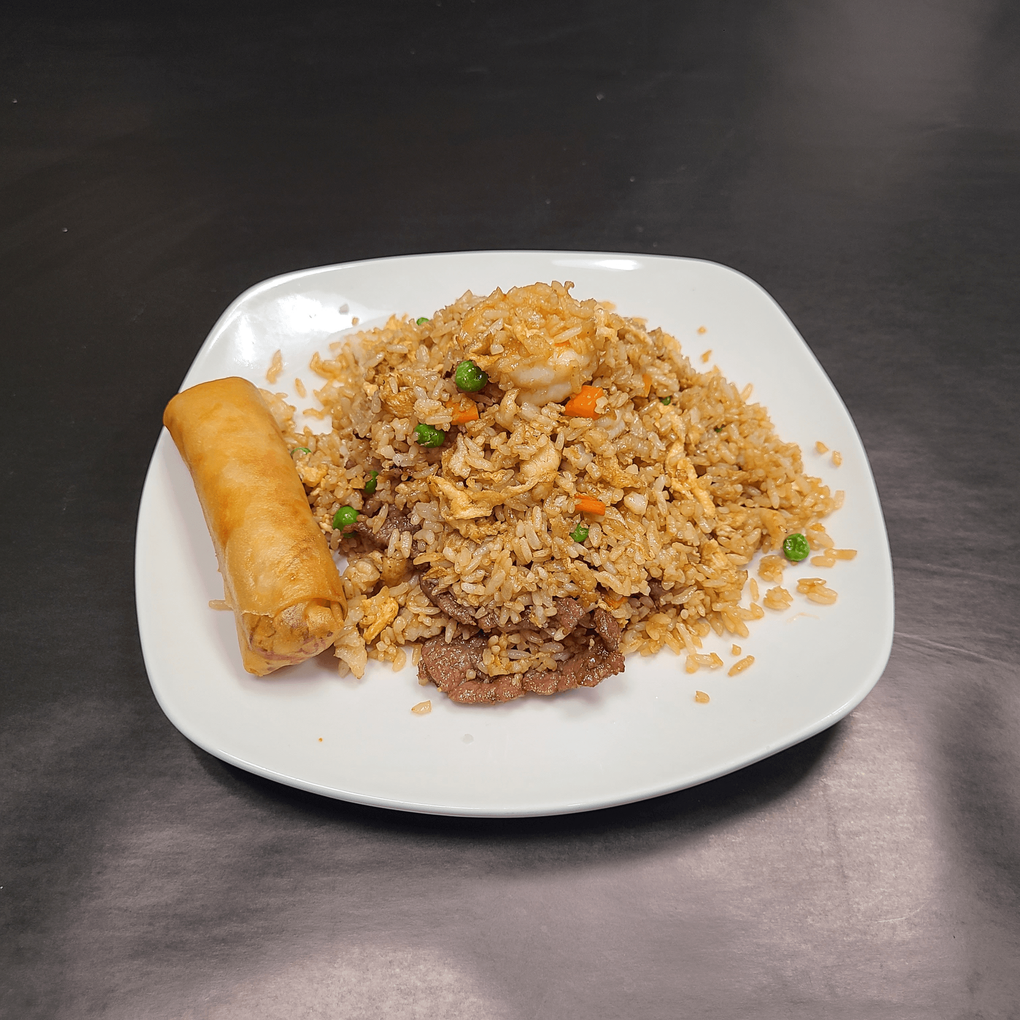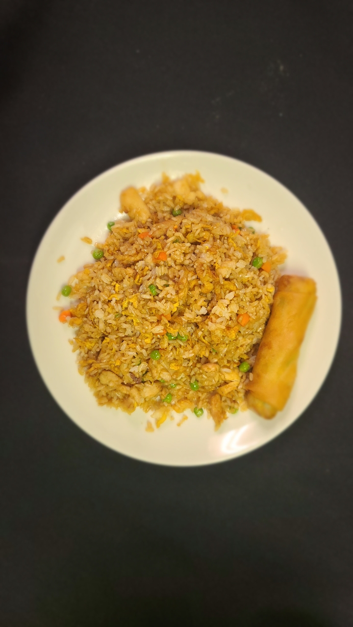 White rice, eggs, green peas & carrots sautéed together in a well-seasoned and lightly drizzled soy sauce wok-toss
