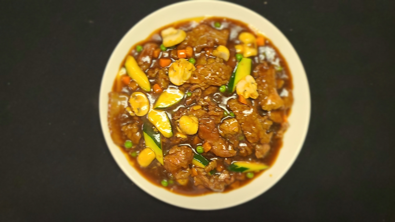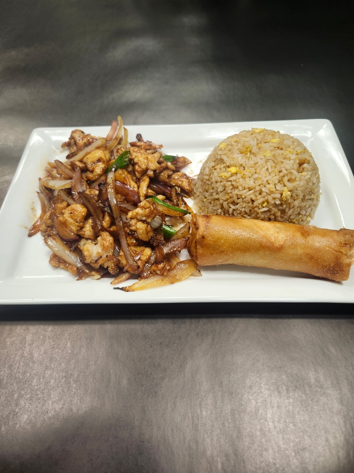 A combination of fresh vegetables and tender, marinated pork, sauteed together in our signature rich and savory brown sauce