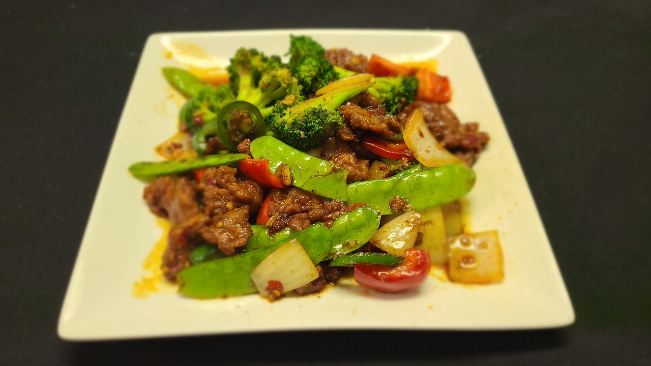 Tender, prime cuts of flank beef, peanuts, chili pepper, and fresh vegetables sautéed in a spicy, peppery sauce