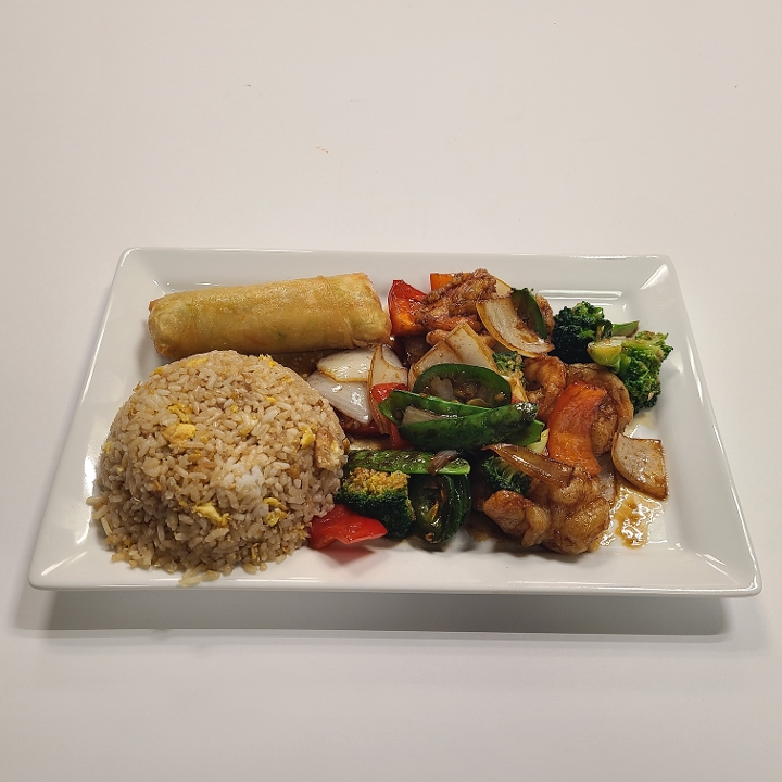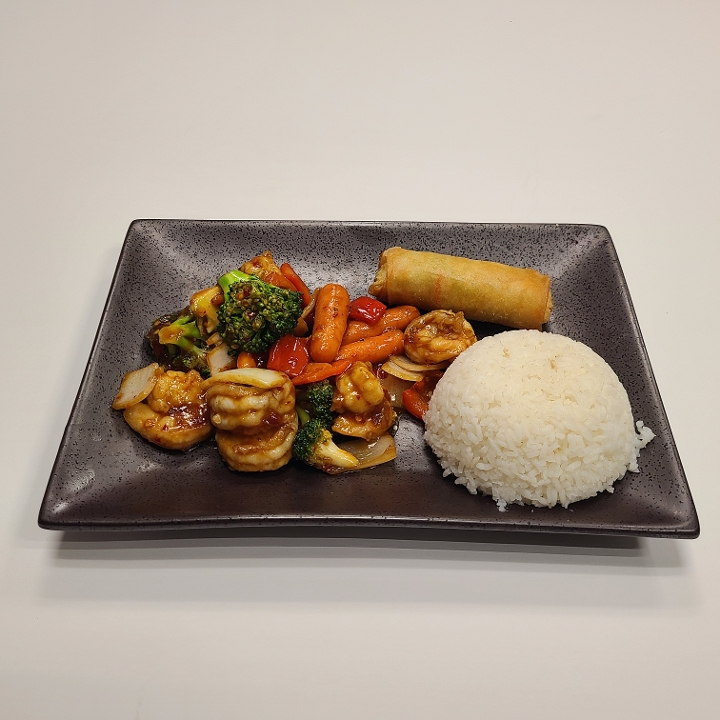 A combination of fresh vegetables and marinated jumbo shrimp sautéed together in our traditional