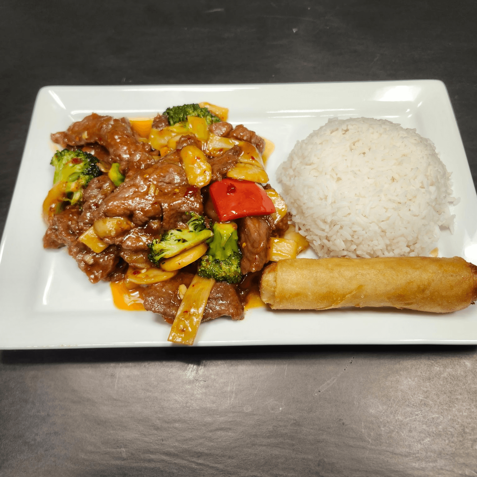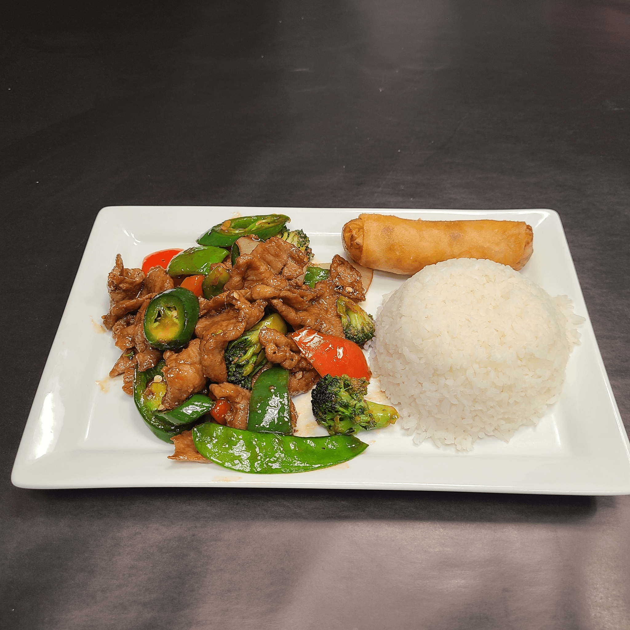 A combination of fresh vegetables and tender cuts of flank beef sauteed in our signature rich and savory brown sauce
