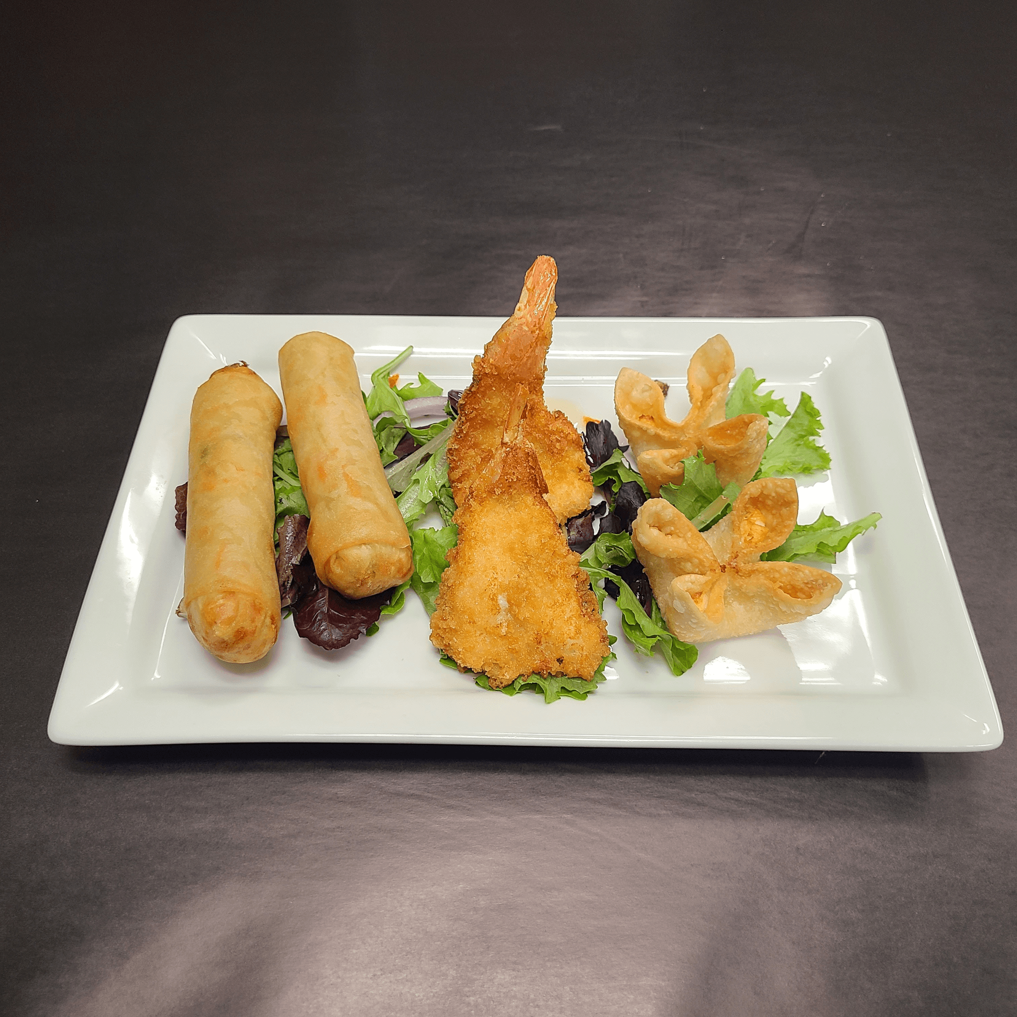 2 vegetable eggrolls, 2 fantail shrimp, and 2 cheese wontons