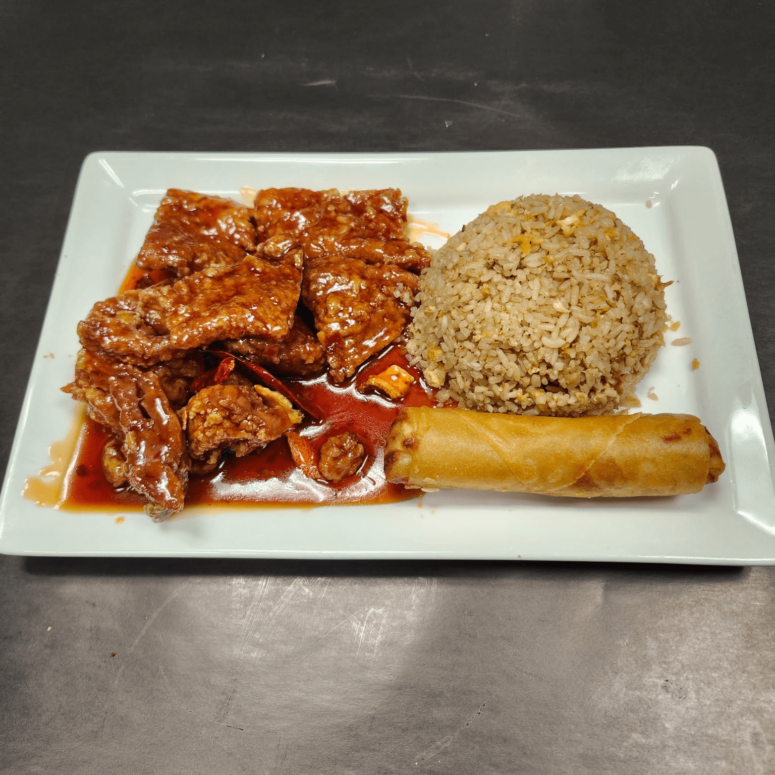 Crispy, breaded prime cuts of flank beef sautéed in a sweet, spicy, and slightly tangy sauce. Served with a side of steamed broccoli