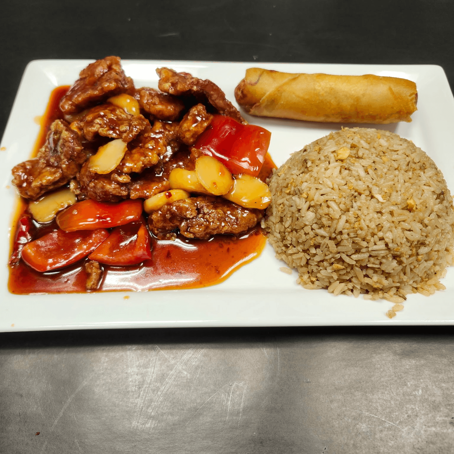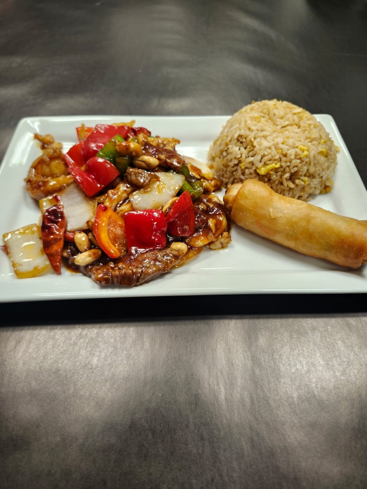 Tender beef stir-fried with crunchy cashews, bell peppers, and onions in a savory, slightly sweet sauce. A flavorful and satisfying dish.