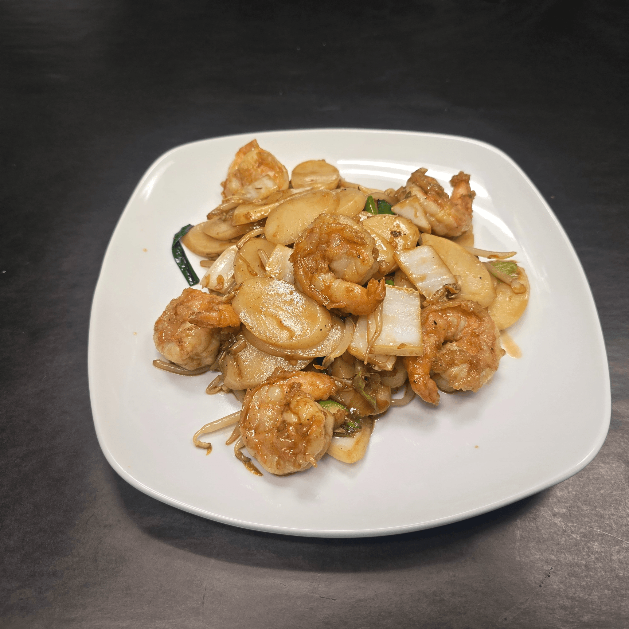 Jumbo shrimp and fresh vegetables sautéed together in our traditional savory, aromatic white sauce. Crispy chow mein noodles add the finishing touch
